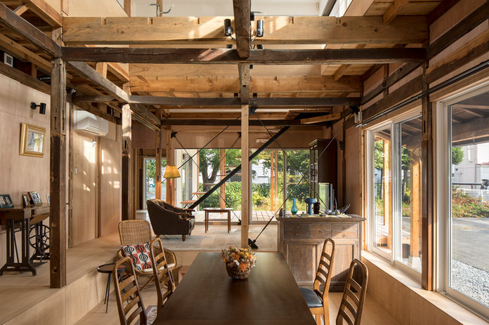 改修対象となる建物の規模が設計与件に比して大きすぎる、という状況は極めて今日的であり、既存建物をボリュームダウンしながら自由な境界を築く本計画の手法は、様々な場面で参照可能である。この家は、縮小時代に住宅ストックを豊かな建築資源に読み換える筋道を示す実践的構法のプロトタイプとしての価値を有している。一方で、固有解として眺めると、そこにはプロトタイプという説明に納まりきらない具体的な「家」の気配を認めざるを得ない。住宅建築は人に住まれることで初めて持続可能となる。過去に幾度か行われたらしい増改築と今回の改修は等価であり、その時々に住むために必要な改修が塗り重ねられて、今日までこの家は存続している。この事実を表現上の手掛かりとして、構造体は可能な限りそのまま利用しながら最小限の手数で設計与件を満たし、性能を向上させた。結果として恣意的な表現は削ぎ落とされ、度重なる改修の空気感が重奏する場所が生まれた。それはまるで「住み継ぎの意志」がそのまま空間化したようでもある。