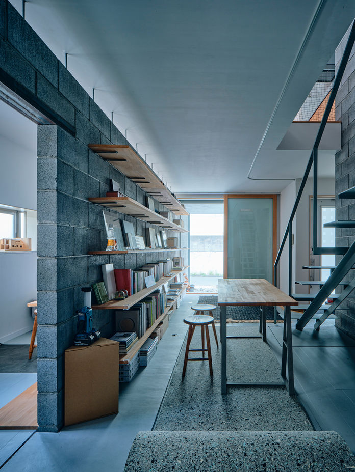 The project site, which lies in a fire protection zone, was originally occupied by four cookie-cutter detached houses. These ready-built houses were each built as two-story, semi-fire-resistant wooden buildings with gross floor areas of 99 square meters, and they together form a so-called “mini-development”. The client had purchased one of the houses second hand with the intention of having it renovated. Although the roughly 20-year-old building showed no performance issues, it required extensive remodeling to meet the client’s needs. Having determined that the micro-landscape created by the four houses should be redesigned to generously embrace various things than to establish a bold contrast with its surroundings, I decided to introduce new cinder block walls that possess the soundness needed for rewriting the whole site while giving careful consideration to their placement in relation to the interior and exterior of the existing building and the effects that they achieve. This was a process comparable to setting stones in a garden. By placing one wall to breach the original envelope of the departitioned building and a second wall to pierce through the first and second levels, I was able to rearrange the functions of the house as appropriate for each location, expand the tonal range of the living spaces, and add breadth and shadow to the site. While the walls have brought with them new functions such as a light garden, library, closet, workspace, and staircase, they were designed so that they would not become any one of these things in particular. The essential role entrusted to these walls is rather to provide spiritual anchors for the residents to be able to recognize, and deepen their affection for, this place as their home. This, I believe, is architecture’s most primordial function.