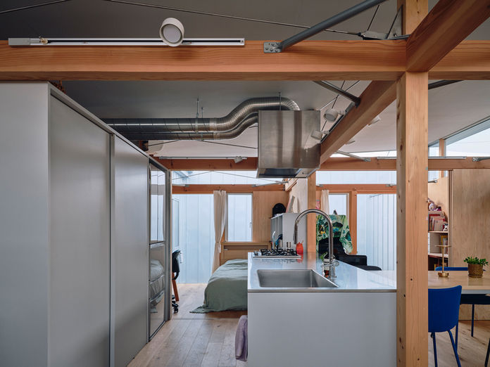 この「住まい」と「外構」の図式を建築内部に持ち込むことで設計はさらに展開する。2,730mmグリッドに沿って立つ木柱の上部に廻る小屋梁を境に断面的に2つのゾーンを定めた。FL~小屋梁の間は生活のためのゾーンである。間仕切り壁の設置は最小限にとどめ、かわりに柱間にフルハイトの3枚引戸を設置することで可変的に使える住空間としている。そして人の目線の少し上、梁上~天井の間は電気と設備のためのゾーンとした。通常は隠蔽されることも多い配線・配管ルートであるが、「生活を支える舞台裏である」という意味でこれを「もうひとつの外構」と位置付け、すべて現しで納めている。断面構成に対応するように小屋梁上部にハイサイド窓を配することで、全ての仕組みが見える抜けの良いスペースとなった。